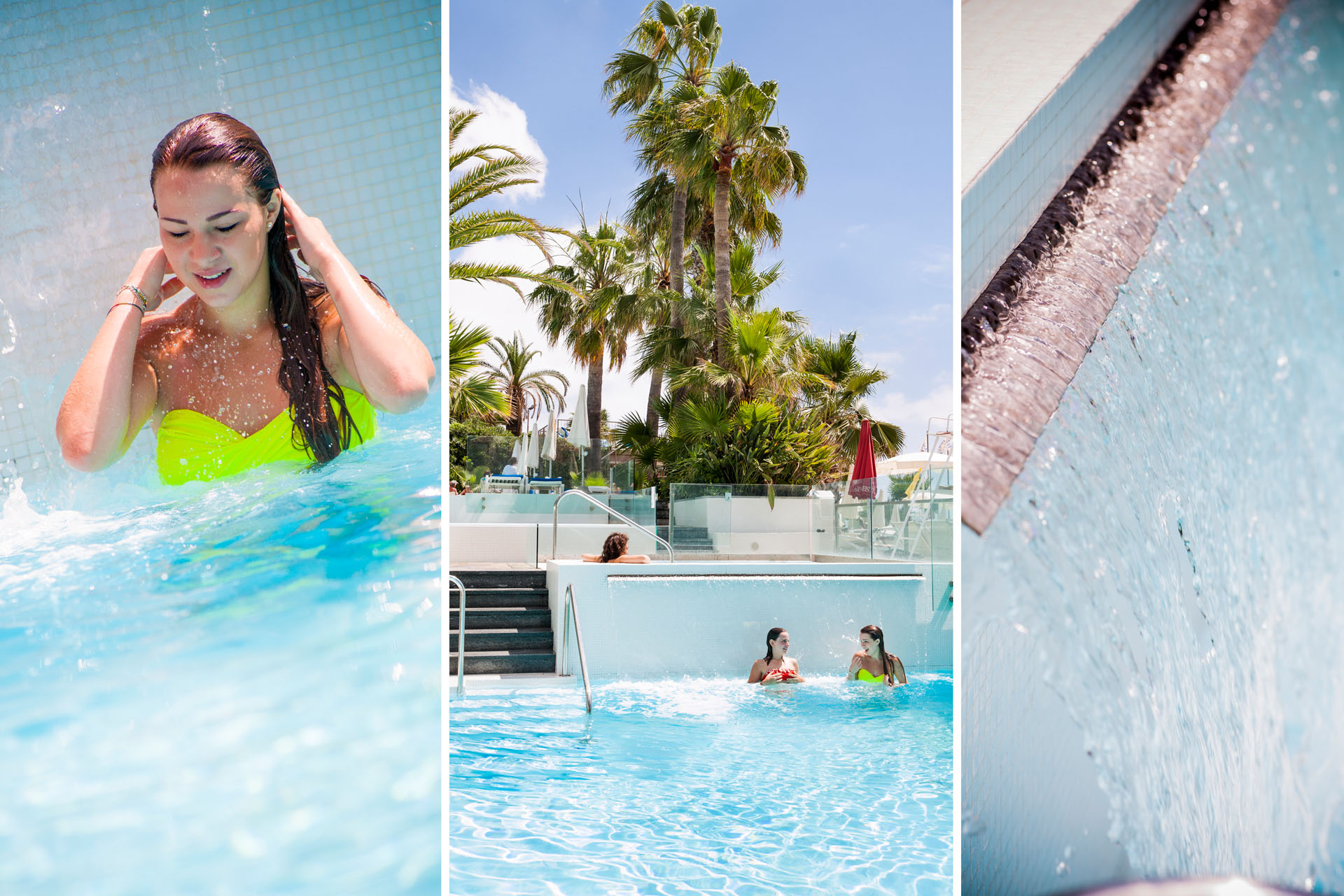 Immergiti nelle tre piscine talassoterapiche esterne, posizionate accanto alla spiaggia e dotate di geyser, lettini effervescenti, cascata, nuoto controcorrente.
